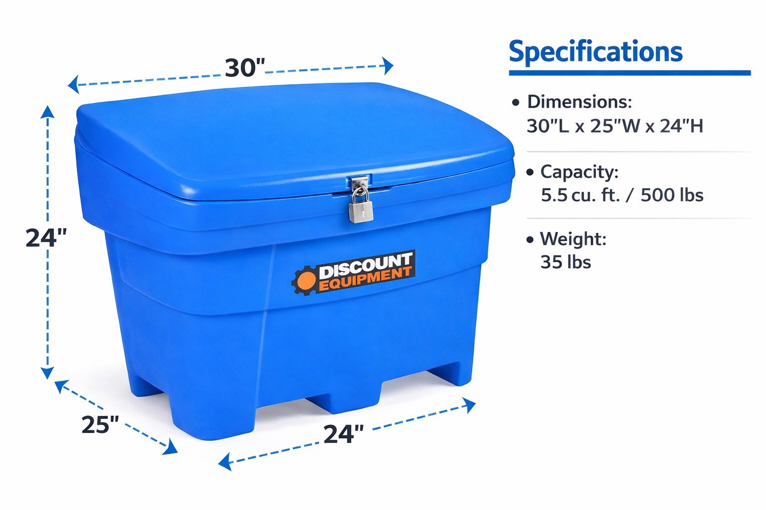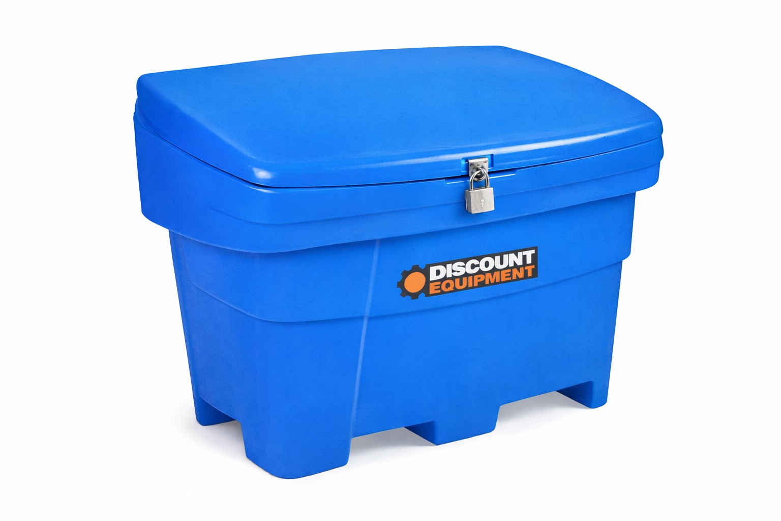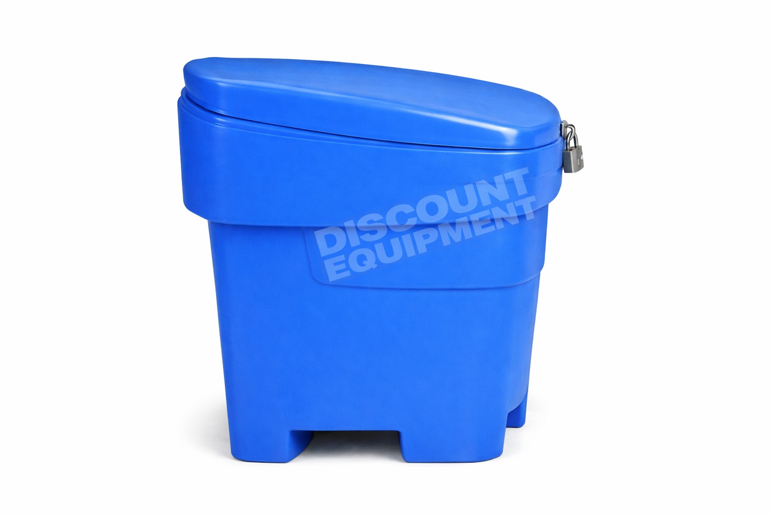 Ideal for storing magnesium, calcium chloride, and rock salt, this heavy-duty unit features double-wall, UV-resistant all-weather construction, reinforced forklift pockets for easy handling, and a sealed lid to keep material dry and clump-free.