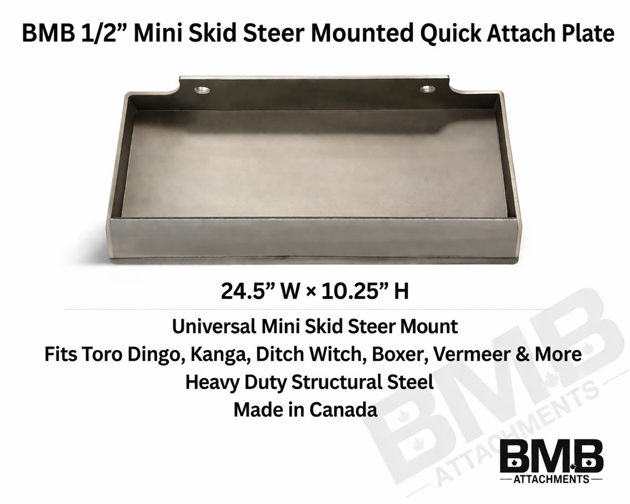 It is common and safe to use if there is a tiny gap during installation. The BMB Universal Quick Mount Plate Fits the following Mini Skid Steers: Toro Dingo – Boxer -Vermeer-Ditch Witch – Rameod – Kubota – Kanga – Baumalght – Boleco -Thomas and most of Asian Diesel Model and can be converted with Quick Attach Kits to fit a full-size Skid steer and tractors